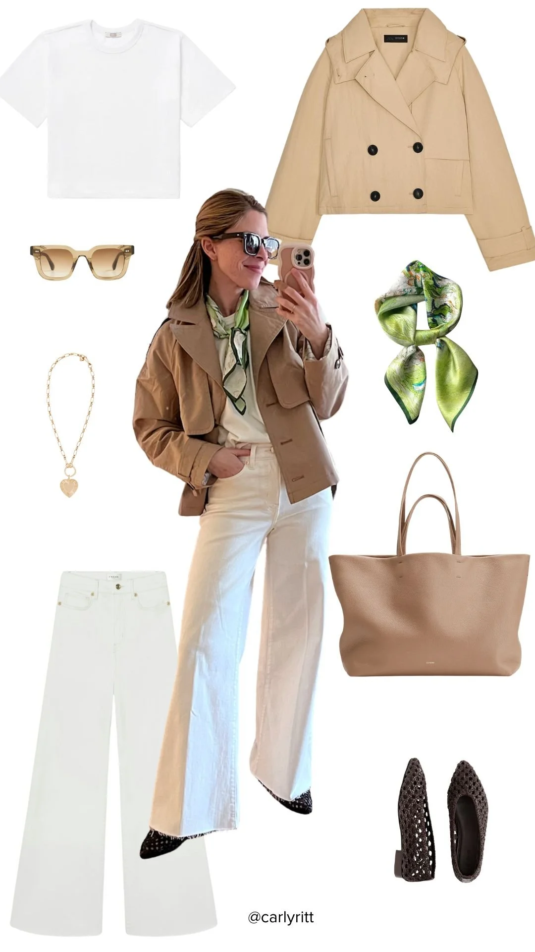 So welcome to an updated outfit that I hope to wear around NYC next month. It’s several of my tried and true closet staples (the tee, sunglasses and tote) plus a new trench, scarf and woven flats that I added for spring.